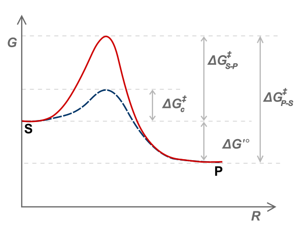 Ферменты вызывают катализ, более прочно связываются с переходными состояниями, чем субстраты и продукты. В сайте каталитического связывания на субстрат могут действовать несколько различных взаимодействий. Они варьируются от электрокатализа, кислотного и основного катализа до ковалентного катализа и катализа ионами металлов[11]. Эти взаимодействия уменьшают энергию активации химической реакции, обеспечивая благоприятные взаимодействия для стабилизации высокоэнергетической молекулы. Связывание ферментов обеспечивает более близкое расположение и исключение веществ, не имеющих отношения к реакции. Это специфическое связывание также препятствует побочным реакциям[14][11].