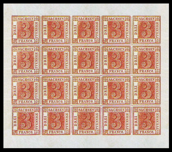 Ещё более уникален сохранившийся полный нештемпелёванный типографский лист. Его происхождение овеяно легендами. По одной из них, лист был найден приклеенным к деревянной балке в старом крестьянском доме, где раньше размещалась почтовая станция; по другой — работник маленького почтамта в Айбенштоке обнаружил его на деревянной балке чердака; по третьей версии, лист был найден в Дрездене приклеившимся к почтовому стеллажу при переезде саксонского почтамта в новое помещение в 1870 году. Лист получил сильные повреждения при отделении от предмета, к которому был приклеен. В таком виде лист долго не находил покупателей, пока его не приобрёл за гроши какой-то мелкий торговец[4][6].