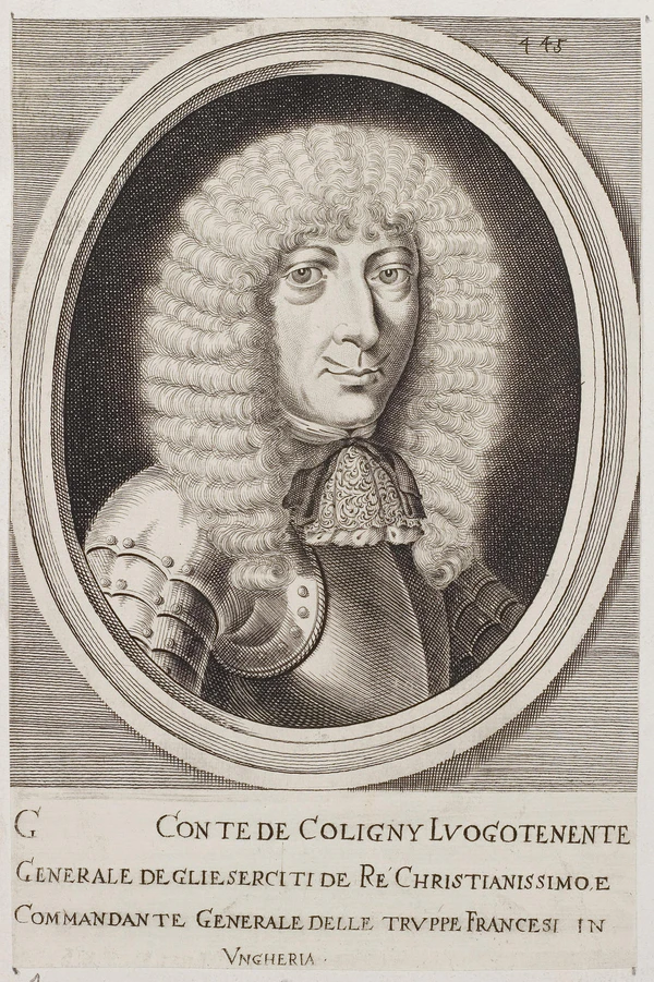 12 марта 1664 был назначен генерал-лейтенантом и командующим шеститысячным корпусом, посланным Людовиком XIV на помощь императору для борьбы с турками в Венгрии. 1 августа французы сражались на левом крыле императорской армии в битве при Сент-Готарде. Сражение началось в девять часов утра и длилось до четырех часов пополудни. Турки привели в беспорядок части принца Баденского, но Колиньи со свои корпусом обрушился на неприятеля, восстановил положение на поле боя и заставил противника отступить за Рааб, собственноручно убив до трех десятков османов[2].