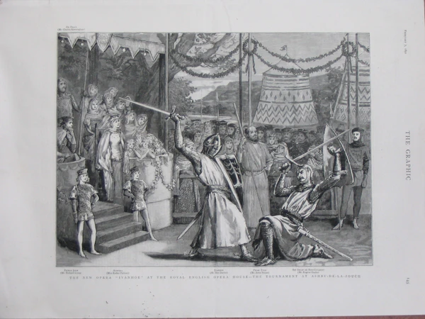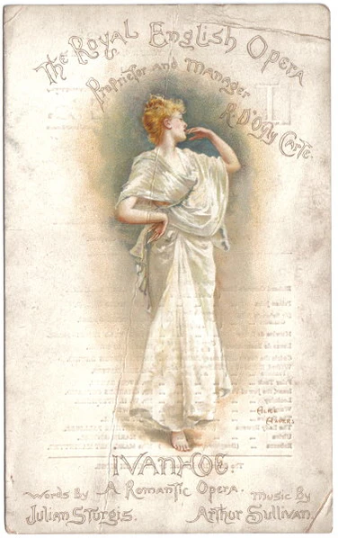 Единственная большая опера Салливана — «Айвенго», по роману Вальтера Скотта, была окончена позднее установленной договором даты, в связи с чем он был обязан оплатить Карту неустойку в размере 3 000 фунтов[90]. Опера была впервые исполнена 31 января 1891 года на открытии нового театра Карта — Королевского театра английской оперы. Исполненная 155 раз подряд она получила хорошие отзывы[91]. Впоследствии Карт не смог пополнить репертуар другими большими английскими операми, а «Айвенго» даже обвинили в неудачах этого нового театра. Её исполняли также во время гастролей 1894—1895 годов, после чего она была надолго забыта[92]. Критик Герман Клейн заметил, что опера является «странным сочетанием успеха и неудачи, не имеющего больше аналогов в истории британской лирической антрепризы»[93]. Вопрос о написании новой большой оперы Салливан серьёзно не рассматривал.
