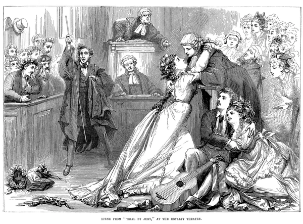 В 1875 году руководителю театра Роялти, Ричарду Д’Ойли Карту, понадобилась короткое произведение, которое бы исполняли вместе с опереттой Перикола Оффенбаха. Вспомнив, что Гилберт предлагал ему либретто, Карт возродил сотрудничество Гилберта и Салливана, в результате чего была написана одноактная драматическая кантата — «Суд присяжных»[48]. Изображённый в ней судебный процесс, в котором главную роль судьи сыграл Фредерик Салливан, брат композитора, стал неожиданным хитом, получил похвалу критиков и был исполнен более 300 раз в течение нескольких сезонов. Газета The Daily Telegraph отметила, что произведение показало большой потенциал композитора в драматургии для простых людей[49], другие обзоры подчёркивали удачную комбинацию слов Гилберта и музыки Салливана. Вскоре после премьеры «Суда присяжных», Салливан написал «Зоопарк», другую одноактную комическую оперу, на либретто Бенджамина Стивенсона[50], но она быстро сошла со сцены. Следующие 15 лет единственным оперным соавтором Салливана являлся Гилберт, с которым они вместе написали ещё 12 опер.