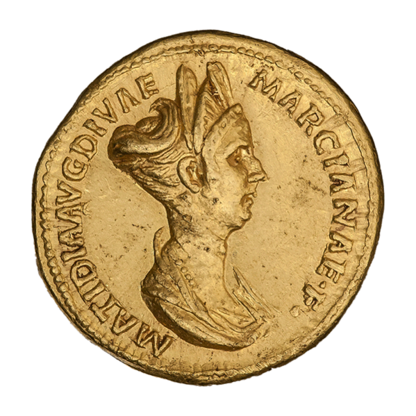 От имени Матидии чеканились римские монеты — золотые ауреусы, серебряные денарии и медные сестерции. Варианты легенд, помещавшихся на аверсах монет с изображением Матидии: DIVA AVGVSTA MATIDIA, MATIDIA AVG DIVAE MARCIANAE F, DIVA MATIDIA AVGVST[3].