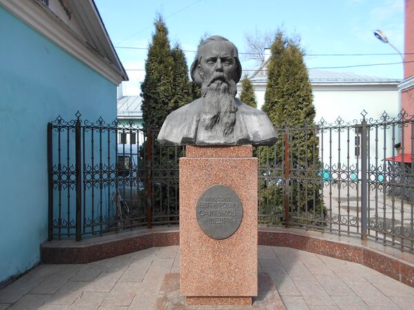 - Кирове. Каменное изваяние, автором которого выступил кировский художник Максим Наумов, расположено на стене здания бывшего Вятского губернского правления (Динамовский проезд, 4), где во время своего пребывания в Вятке Михаил Евграфович служил чиновником.