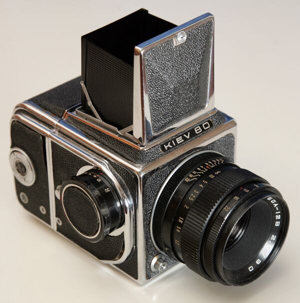 - К фотоаппарату могли присоединяться кассеты на размер кадра 4,5×6 см от камеры «Киев-88».