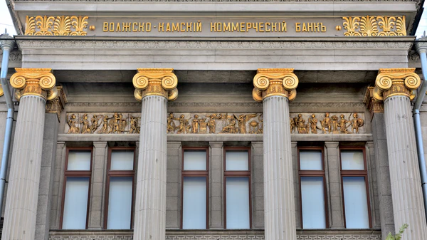 Центральный ризалит украшен четырёхколонным портиком ионического ордера с позолоченной барельефной группой в области треугольного фронтона и с надписью названия банка на фризе между пальметтами. Акротерии центрального портика декорированы пальметтой с волютами и двумя скульптурными изображениями грифонов. Парадный вход составлен тремя высокими дверными проёмами[7].