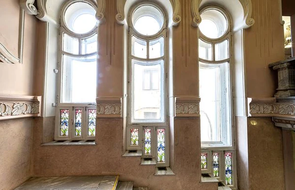 В оформлении интерьеров здания использованы мраморные колонны, пилястры, профилированные тяги и карнизы, ниши, растительный орнамент, лепные элементы (барельефные панно, кадуцеи, розетки, венки, медальоны, маскароны и другие), плафоны с лепниной, паркет, метлахская плитка. В декоре парадной двухмаршевой лестницы сохранились ступенчато расположенные окна с цветными витражами в растительной тематике, характерной для интерьеров модерна начала XX века[7].
