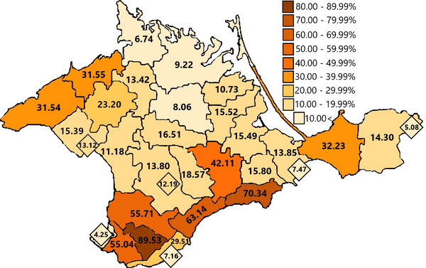 По данным некоторых СМИ, согласно данным Рескомзема (Республиканского комитета по земельным ресурсам) Крыма, всего с 1991 по 2007 годы на полуострове было захвачено более 40 000 гектаров земли. Сейчас на этих территориях расположено около 300 крымскотатарских поселков с населением порядка 200 000 человек[5].