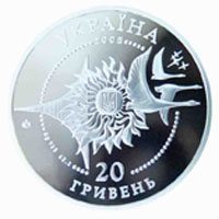 | На аверсе: в круге из бусин — изображение малого государственного герба Украины в окружении аллегорической композиции из Солнца, стилизованного крыла, птиц и звёзд. Логотип Монетного двора НБУ, надписи «УКРАЇНА 2005 20 ГРИВЕНЬ», обозначение металла, его пробы и веса чистого серебра «Ag 925 62,2». На реверсе: самолёт Ан-124 Руслан, голографический логотип «АН», надписи «ЛІТАКИ УКРАЇНИ АН-124 `Руслан`». |