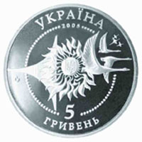 | На аверсе: в круге из бусин — изображение малого государственного герба Украины в окружении аллегорической композиции из Солнца, стилизованного крыла, птиц и звёзд. Логотип Монетного двора НБУ, надписи «УКРАЇНА 2005 5 ГРИВЕНЬ». На реверсе: самолёт Ан-124 Руслан, логотип «АН», надписи «ЛІТАКИ УКРАЇНИ АН-124 `Руслан`». |