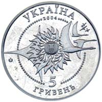 | На аверсе: в круге из бусин — изображение малого государственного герба Украины в окружении аллегорической композиции из Солнца, стилизованного крыла, птиц и звёзд. Логотип Монетного двора НБУ, надписи «УКРАЇНА 2004 5 ГРИВЕНЬ». На реверсе: самолёт Ан-140, логотип «АН», надписи «ЛІТАКИ УКРАЇНИ АН-140 AN-140». |