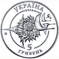 | На аверсе: в круге из бусин — изображение малого государственного герба Украины в окружении аллегорической композиции из Солнца, стилизованного крыла, птиц и звёзд. Логотип Монетного двора НБУ, надписи «УКРАЇНА 2002 5 ГРИВЕНЬ». На реверсе: самолёт Ан-225 «Мрия» над взлётно-посадочной полосой, логотип «АН», надписи «ЛІТАКИ УКРАЇНИ АН-225 `МРІЯ`». |
