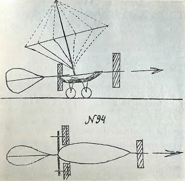 «Во второй половине июля 1885 [года] была предпринята попытка поднять самолёт в воздух. Во время разбега по горизонтально уложенным деревянным рельсам самолёт накренился и поломал крыло…»
