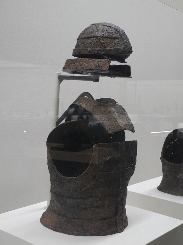 Танко (кираса повернута спиной), шлемы сёкаку-цуки-кабуто (ближний) и мабидзаси-цуки-кабуто (дальний). Токийский национальный музей |