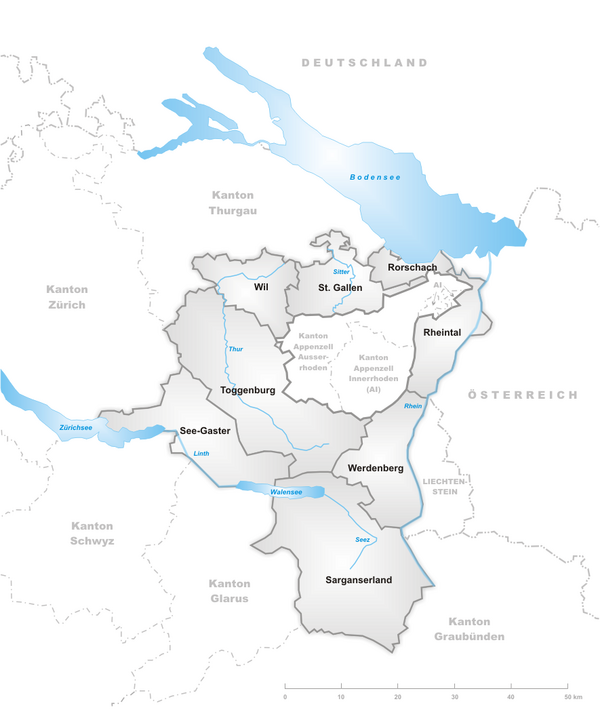 В кантоне Санкт-Галлен административные округа отсутствуют, но он делится на 8 избирательных округов: