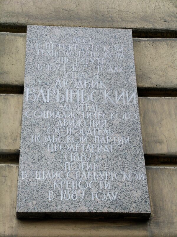 - мемориальная доска (Ф-4) Варыньскому Л., «Здесь, в Петербургском технологическом институте, в 1874—1875 годах учился Людвик Варыньский — деятель социалистического движения, основатель польской партии „Пролетариат“ (1882). Погиб в Шлиссельбургской крепости в 1889 году». 1989. Архитектор Исаева В. В. Гранит.