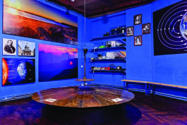 Здесь можно увидеть маятник Фуко, наглядно иллюстрирующий вращение Земли. Длина нити маятника Фуко в Санкт-Петербургском Планетарии около 8 метров.