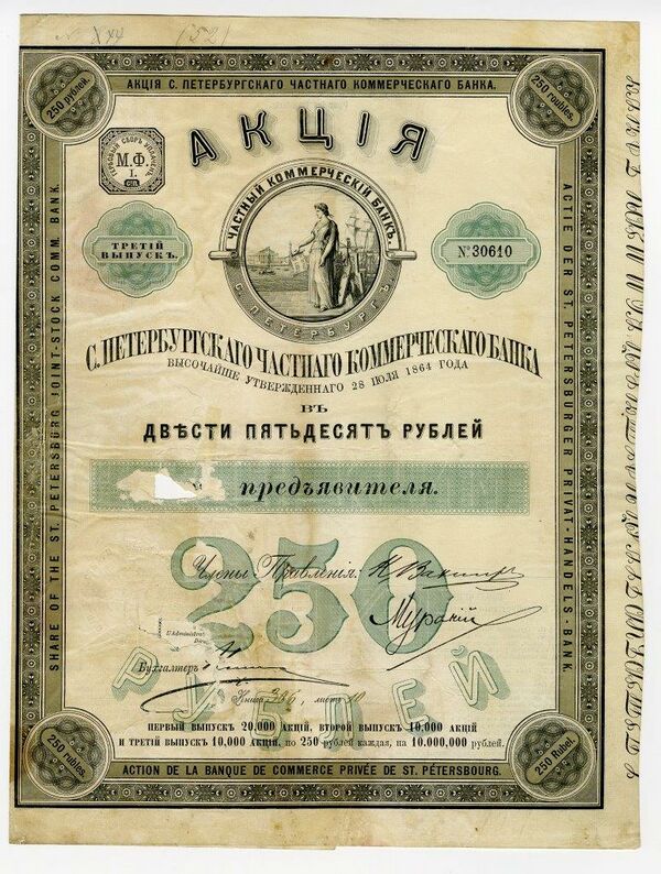 По рекомендации барона А. Л. Штиглица многие банкирские дома Берлина, Лондона, Амстердама, Гамбурга, Парижа и Вены подписались на акции банка общей стоимостью 1 млн рублей. Первым директором банка был назначен Е. Е. Брандт. В 1866 году было высочайше разрешено принимать акции банка в казенные залоги для обеспечения платежа рассроченного акциза за вино и таможенных пошлин[2]. В 1871 году банку было высочайше разрешено проведение за свой счет операций с государственными ценными бумагами, при этом сумма таких операций ограничивалась 4 млн рублей[3].
