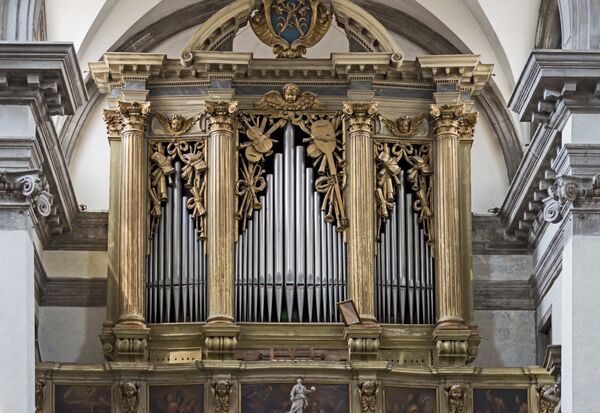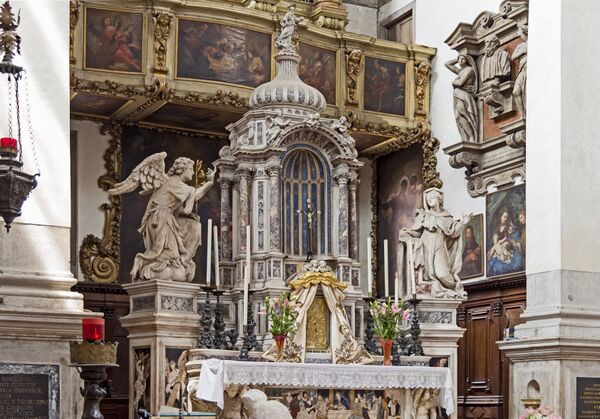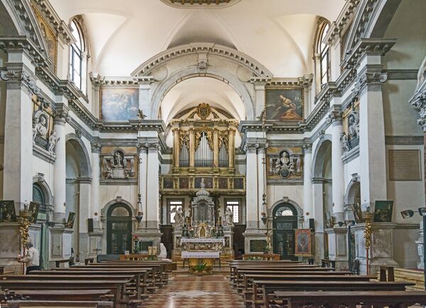 Внутри церковь имеет один неф с тремя короткими приделами с каждой стороны. Апсида, четырёхугольная в плане, перекрыта цилиндрическим сводом. Главный алтарь оформлен скульптурной группой, представляющей "Благовещение Марии работы Генриха Мейринга. За главным алтарем в Сокровищнице находятся картины Якопо Тинторетто с изображениями евангелистов. Плафон нефа украшен большим панно работы Дзанки, Антонио Антонио Дзанки. Вдоль нефа расположены четырнадцать картин на тему «Крестного пути» (1755—1756) работы семи разных художников, в том числе Франческо Фонтебассо, Джанбаттиста Кросато, Гаспаре Дициани и Якопо Мариески.