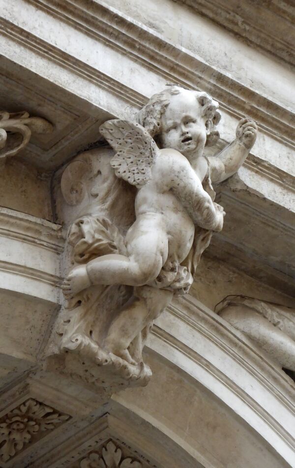 Прославление заказчиков и донаторов (дарителей) церкви — членов семьи Барбаро — определило композицию её фасада. Вместо обычных фигур святых на нём появились рельефные карты различных мест, где служил Антонио Барбаро: Рим, Задар, Кандия, Падуя, Корфу и Сплит, а в нишах установлены статуи братьев Барбаро. Скульптуры и рельефы перемежаются со сдвоенными каннелированными колоннами в двух ярусах: внизу — ионическими, вверху — коринфского ордера (в нарушение правила ордерной суперпозиции).