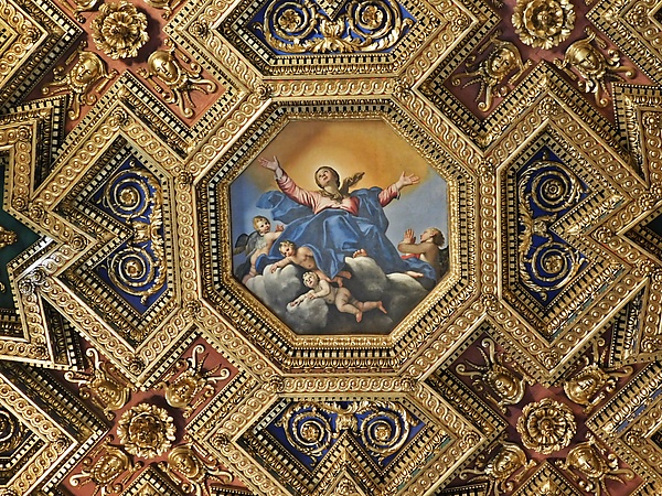 Плафон оформлен рельефной позолоченной резьбой. В центральном восьмигранном клейме имеется роспись XVII века: «Вознесение Мадонны» работы Доменикино[4].