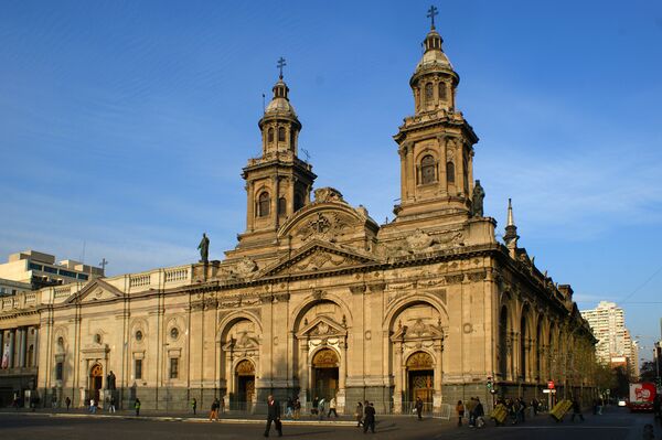 В центре города находится прямоугольная площадь Пласа де Армас («Оружейная площадь»), которая является главной площадью столицы. По её периметру расположены здания в стиле барокко, построенные в колониальный период. Из них наиболее примечателен католический собор (1541—1619 годы), президентский дворец Ла Монеда (1780—1805 годы) и Ратуша (XVIII век). Главная улица города — авенида Бернардо О’Хиггинса, которую также часто называют Аламеда («Тополевая аллея»)[38]. В числе других архитектурных достопримечательностей — монетный двор, церковь Святого Доминика и церковь Сан-Франсиско, построенная в 1618 году. В столице часто встречаются постройки в стиле модерн, неоклассики и неоготики. XX век добавил к облику города комплекс высоких административных и жилых зданий. Ещё одной достопримечательностью города является площадь Бакедано, которая была открыта в 1928 году. На её территории построен памятник, созданный чилийским скульптором Вирджинио Ариасом, в честь генерала Мануэля Бакедано. Расположена в центре города недалеко от реки Мапочо.