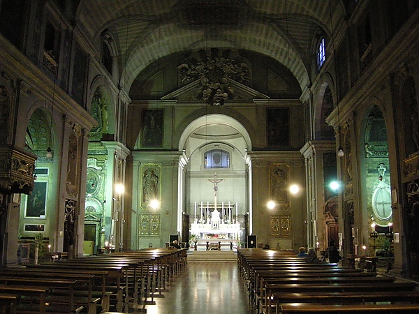 Внутри церковь имеет один неф с боковыми капеллами. На боковых стенах, в регистре над арками, расположен цикл росписей работы художников периода Контрреформации 1580-х годов: Алессандро Фея дель Барбьере, Бартоломео Кардуччи, Лоренцо Вайани делло Шорина, Бернардино Поччетти и Джироламо Маккьетти[2].