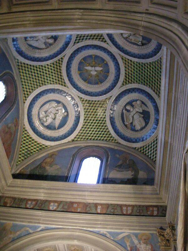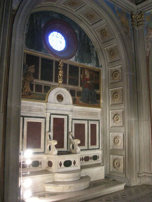 Сцена Благовещения Марии, «Четыре евангелиста и четыре Отца Церкви» в верхней части торцовой стены капеллы, напротив надгробия, принадлежит Алессио Бальдовинетти и представляет собой выдающееся произведение флорентийского кватроченто[9]. Сводчатый потолок капеллы сплошь облицован блестящей глазурованной майоликой работы Луки делла Роббиа (1467). В центре плафона — голубь Святого Духа, а в круглых медальонах по углам — символы добродетелей кардинала ((Умеренность, Благоразумие, Справедливость и Сила). Мраморное епископское кресло — работа Антонио Росселлино (1466 года). Стены, пол, пилястры создают торжественный колорит за счёт облицовки серым камнем «пьетра-серена» и мраморной мозаики «косматеско». Ранее в капелле было много позолоты (не сохранилась, как и деревянные кресла, и дорогая утварь).