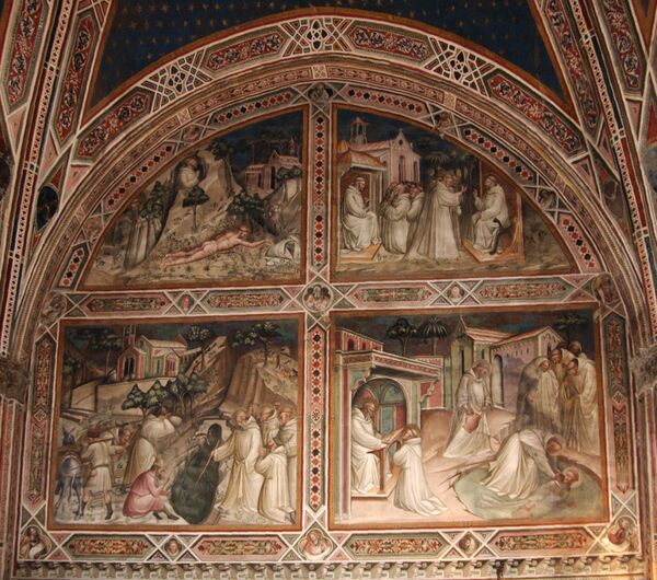 Справа от пресбитерия имеется проход в Сакристию, расписанную фресками Спинелло Аретино (1387) со сценами истории Святого Бенедикта.
