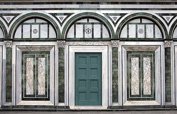 Примечательно, что весь фасад (без треугольного фронтона и боковых скатов), как и в церкви Санта-Мария-Новелла (проект Л. Б. Альберти), точно вписывается в три модульных квадрата: два внизу и третий наверху (реконструкция Р. Виттковера)[3]. В целом композиция нижнего яруса следует традиции аркад, начало которой во Флоренции послужило творчество Филиппо Брунеллески. Верхний ярус включает прямоугольное окно, обрамлённое наличником с двумя колонками, поддерживаемыми мраморными львиными головами, увенчанными тимпаном, в центре которого находится инкрустация в виде вазы между двумя голубями. Над окном расположена мозаика XII века «Христос между Мадонной и Св. Миниато» (1260)[4].