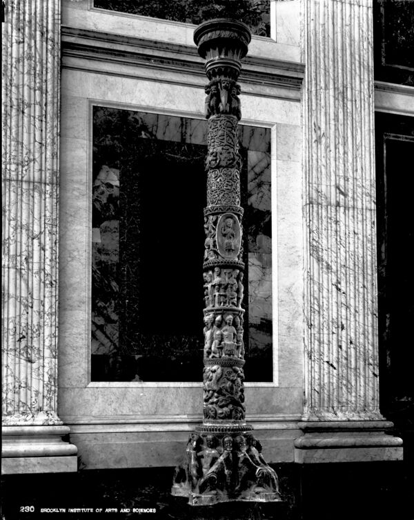 На базе колонны — горельефные изображения женских полуфигур и симметрично-удвоенных (симультанных) миксантропических (смешанных) существ, напоминающих сфинксов: с телом льва и головами (попеременно) человека и барана. В. Г. Власов, опираясь на исследования Дж. Фергюсона, Дж. А. Холла и, в особенности, К. Леви-Стросса о симультанных (симметрично развёрнутых изображениях)[17] интерпретировал повторяющиеся женские фигуры между львами в качестве «вавилонских блудниц»[18].