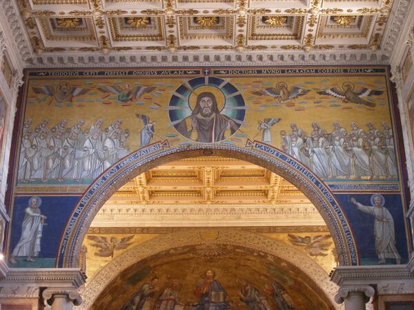 Мозаика конхи апсиды создана в 1220—1227 годах во время понтификата Гонория III с привлечением мастеров, которые работали над мозаиками собора Сан-Марко в Венеции. В центре изображена фигура Христа-Искупителя (Cristo del Redentore), восседающего на троне с раскрытым Евангелием в левой руке и благословляющего правой. У Его ног маленькая коленопреклонённая фигурка Папы Гонория III, заказчика мозаики. По сторонам — две пальмы (символ Рая), фигуры святых Петра, Павла, Андрея и Луки.