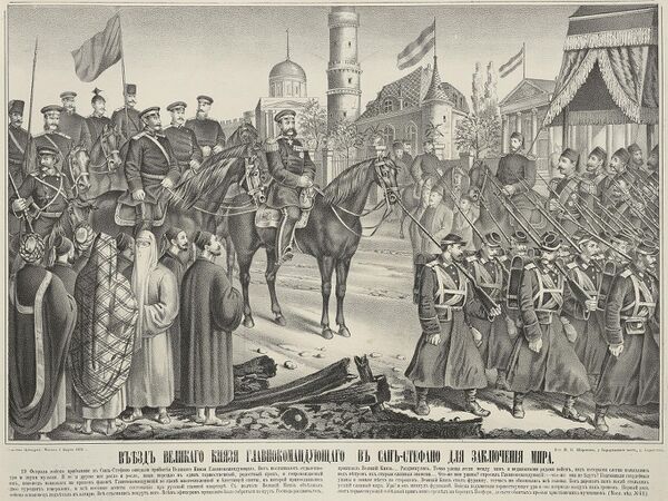 В последовавшей русско-турецкой войне Россия завоевала почти всю европейскую часть Османской империи и только Константинополь не был взят из-за вмешательства западных держав. Великобритания и Франция видели в столь значительном возрастании российского могущества ущерб своим интересам и выслали средиземноморские флоты к проливам, чтобы продемонстрировать присутствие. С оглядкой на это Россия в Сан-Стефанском договоре с Турцией попыталась зафиксировать достигнутые успехи, а Турция была вынуждена принять максимальные российские требования.