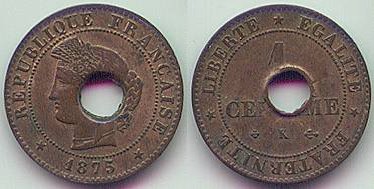 Монеты в 1 сапек были изготовлены из французских монет в 1 сантим, в которых на сайгонском арсенале были проделаны отверстия.