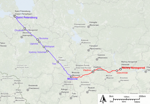 Чудово-Московское[к 1], Окуловка, Тверь, Москва (Курский вокзал), Владимир, Дзержинск |