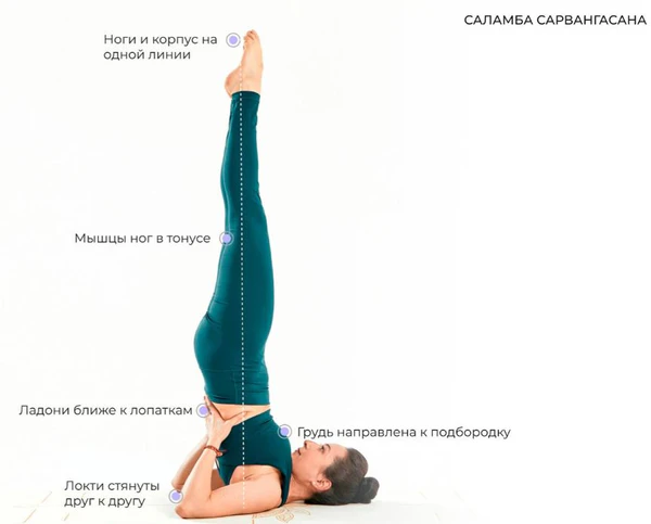 Сарвангасана — это перевёрнутая асана, при её выполнении ноги находятся выше головы, опорой выступают затылок, задняя часть шеи и плечи[4]. Упражнение требует активной работы мышц шеи и плеч[5].