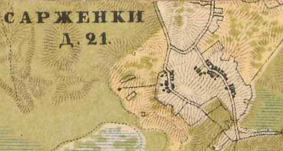 САРЖЕНКА — деревня, на земле Агалатовского сельского общества, при просёлочной дороге, при родниках 34 двора, 57 м. п., 84 ж. п. — всего 141 чел. (1896 год)[14]