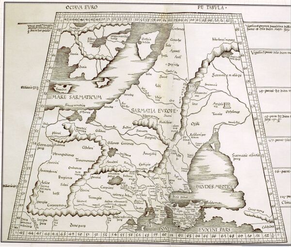 Клавдий Птолемей в своём трактате «Руководство по географии»[33][34] писал о Европейской[35] и Азиатской[36] Сарматиях, границей между которыми полагал реку Танаис.