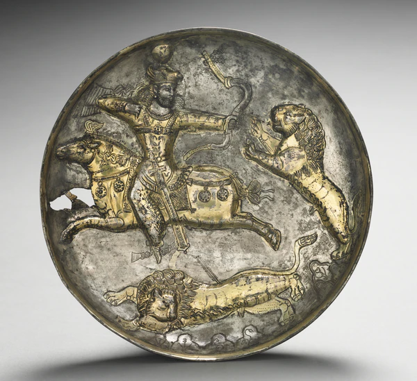 Зачастую правитель изображается на охоте. Обычно он сидит на лошади, которая движется летящим галопом. Он стоит с мечом, направленным на опасное животное, такое как кабан или лев, или стреляет из лука. Лицо часто представлено в ракурсе 3/4[17].
