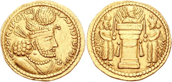 Сасанидские монеты являются особенно значимым материалом по одной важной причине: их легко датировать по всем периодам сасанидской истории. По имени правителя, изображённого на монете на пахлави, можно датировать и другие произведения искусства. На лицевой стороне обычно изображён портрет правителя, иногда вместе с сыном или женой, реже — с обоими. На оборотной стороне изображено несколько сцен, в том числе инвеститура или алтарь, на котором горит вечный огонь. Традиция этих рисунков начинается с довольно грубого изображения Ардашира I (224—242 гг.) и при Шапуре I (240—270 гг.). При Шапуре II (310—379 гг.) монеты изготавливаются из того же материала, но детализация моделировки несколько снижается. Однако позже это снова становится важным. В последующий период орнаменты часто сильно стилизованы и зафиксированы частично.