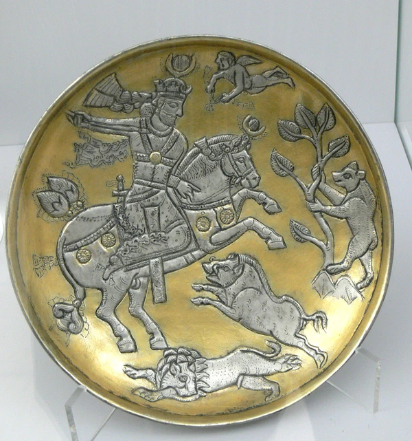 До наших дней дошло множество сасанидских серебряных сосудов, особенно больших тарелок или чаш, использовавшихся для подачи пищи. Они имеют высококачественные гравированные или чеканные украшения из придворного репертуара, изображающие конных царей или героев, а также сцены охоты, сражений и пиршеств, часто частично позолоченные[15]. На фужерах, предположительно для вина, могут быть рельефно изображены танцующие девушки. Они экспортировались в Китай, а также на запад[16].