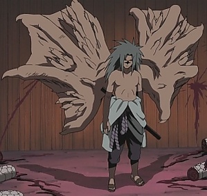 Во время экзамена на звание тюнина, Оротимару, нукэнин и опасный преступник, искавший новое тело для продления своей жизни, оставил проклятую печать на шее у Саскэ, произвольная активация которой, причиняя боль своему носителю, в то же время позволяет использовать бо́льшую по сравнению с обычным состоянием силу. После окончания экзамена в лесу Какаси частично запечатывает метку Оротимару, сила которой теперь может освободиться лишь в зависимости от желания носителя.