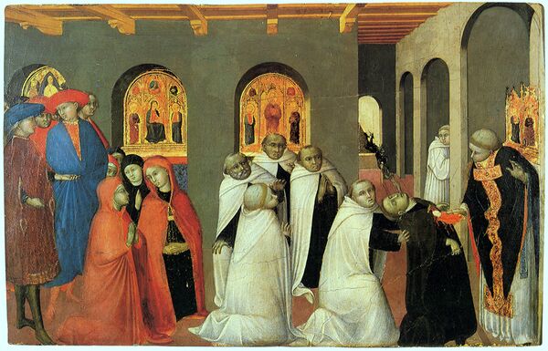 Первый, известный сегодня из документов, заказ на создание алтарной картины он получил в 1423 году от гильдии торговцев шерстью «Арте делла Лана», которая хотела украсить свою капеллу в церкви Сан Пеллегрино в Сиене. Сегодня это произведение Сассетты известно под названием «Алтарь Евхаристии»[4].