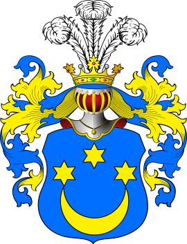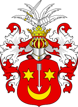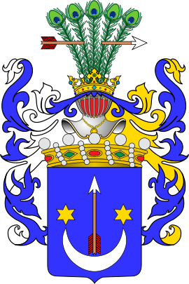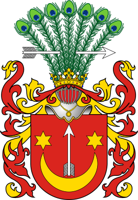 В красном поле(Сас II), в голубом поле(Сас I) серебряный полумесяц, рогами обращённый вверх и имеющий на концах по золотой шестиугольной звезде, а из средины его летит вверх стрела. Над шлемом семь павлиньих перьев — павлиний хвост, пробитый стрелой вправо.