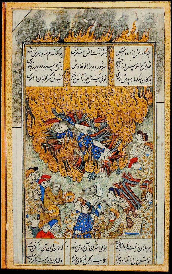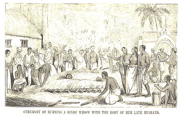 Большинство иностранцев, побывавших на субконтиненте в средние века, было из Западной Азии: в основном — мусульмане, а позже — европейцы. И те, и другие были очарованы этим обрядом, иногда описывая его как ужасный, но очень часто также как ни с чем несравнимое выражение преданности[42]. Арабский путешественник Ибн Баттута описал один такой ритуал, но признался, что ему стало дурно и его унесли оттуда. Европейские художники XVIII столетия создали множество изображений, на которых вдовы представали высокоморальными, достойными подражания героическими женщинами[43].