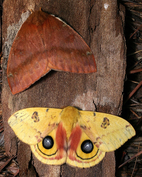 Размах крыльев 6 до 9 см. Выражен половой диморфизм. Самка имеет красновато-бурые передние крылья и лапки, в то время как самец имеет жёлтые передние и задние крылья, тело и лапки. Задние крылья самца и самки несут так называемые глаза, которые имеют чёрный цвет, а в центре находится белая точка. Заднее крыло возле своего корня имеют яркий красный окрас.