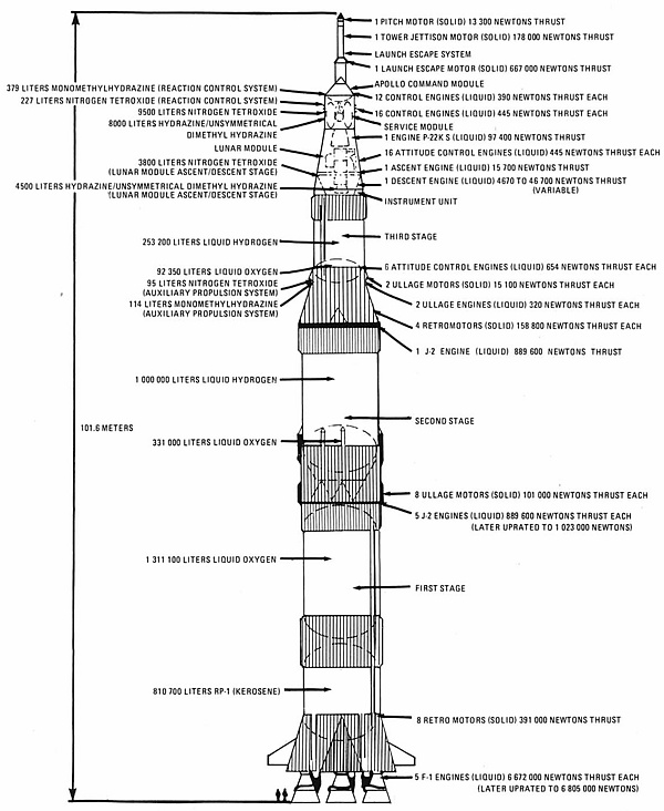 «Сатурн-5» состояла из трёх ступеней: S-IC — первая ступень, S-II — вторая и S-IVB — третья. Все три ступени использовали жидкий кислород как окислитель. Горючим в первой ступени был керосин, а во второй и третьей — жидкий водород