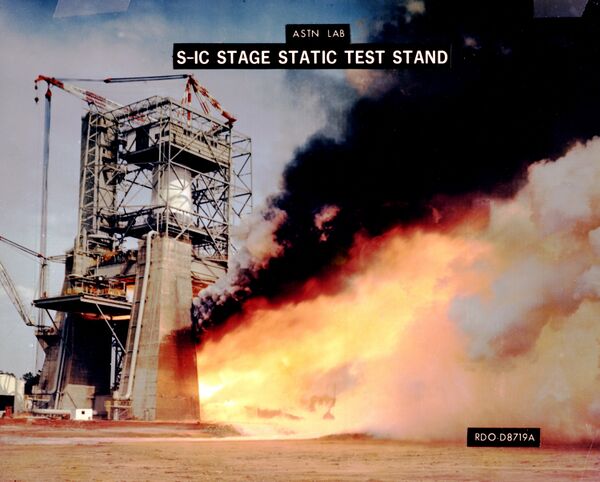 S-IC производилась компанией «Боинг». На ступени было установлено пять кислородно-керосиновых двигателей F-1, суммарная тяга которых была более 34 000 кН. Первая ступень работала около 160 секунд, разгоняла последующие ступени и полезную нагрузку до скорости около 2,7 км/с (в инерциальной системе отсчёта; 2,3 км/с относительно земли), и отделялась на высоте около 70 километров[10]. После разделения ступень поднималась до высоты около 100 км, затем падала в океан. Один из пяти двигателей был зафиксирован в центре ступени, четыре других симметрично расположены по краям под обтекателями и могли поворачиваться для управления вектором тяги. В полёте центральный двигатель выключался раньше, чтобы уменьшить перегрузки. Диаметр первой ступени 10 метров (без обтекателей и аэродинамических стабилизаторов), высота 42 метра.