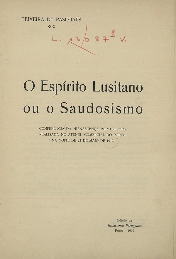 Манифестом течения считается доклад Тейшейры де Пашкуайша O Espírito Lusitano e o Saudosismo («Лузитанский дух и саудозизм») на его первой конференции от общества Renascença Portuguesa в мае 1912 года[3].