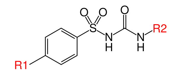 Сульфаниламидные препараты являются производными сульфонилмочевины и отличаются между собой дополнительными соединениями, введёнными в основную структуру. Механизм сахаропонижающего действия связан со стимуляцией секреции эндогенного инсулина, подавлением синтеза глюкагона, уменьшением образования глюкозы в печени в процессе глюконеогенеза и повышением чувствительности инсулинозависмых тканей к действию инсулина, за счёт повышения эффективности его пострецепторного действия.[46]