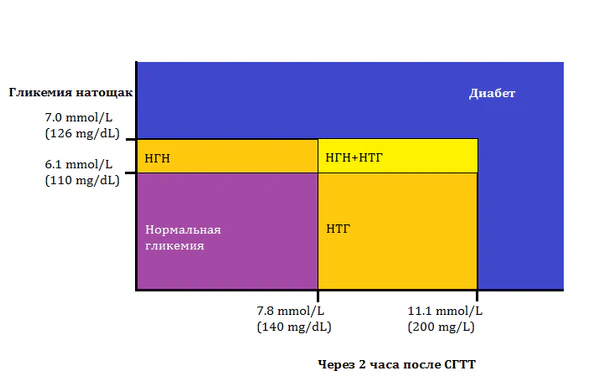 - глюкоза плазмы через два часа после орального глюкозотолерантного теста ≥ 11 ммоль/л;